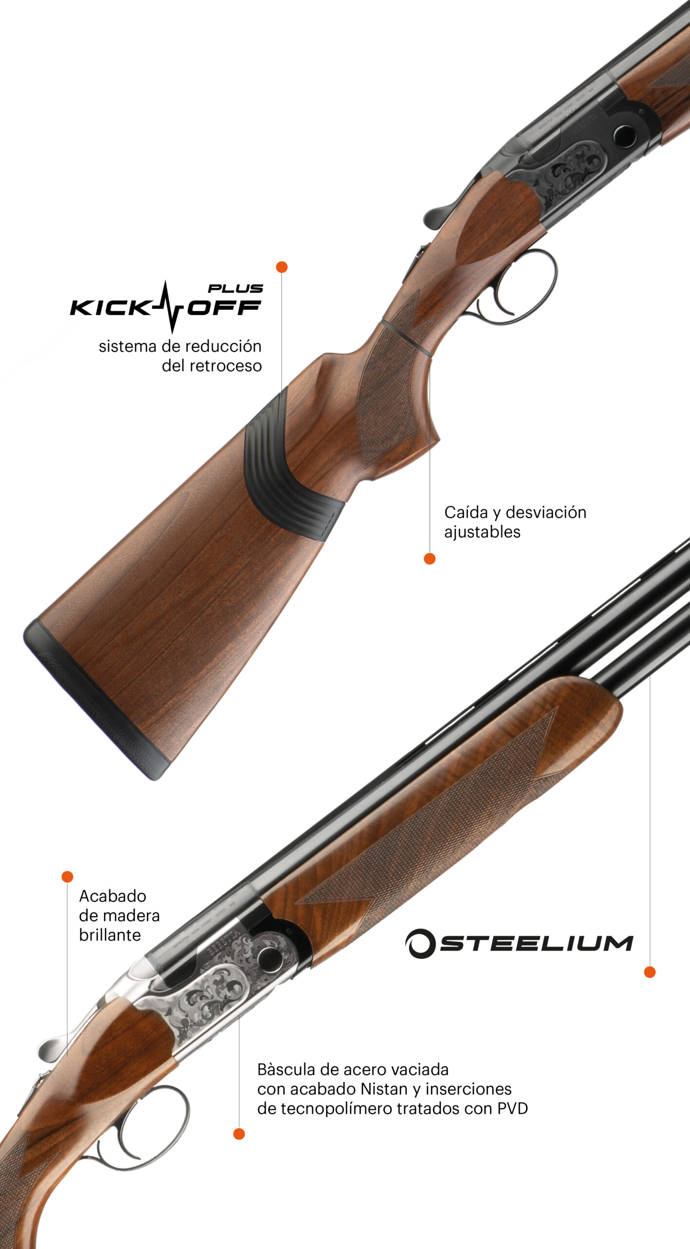 Gracias a la innovadora tecnología Kick-Off® Plus, el retroceso se reduce hasta en un 40%, mejorando el confort de disparo y la estabilidad del segundo tiro.