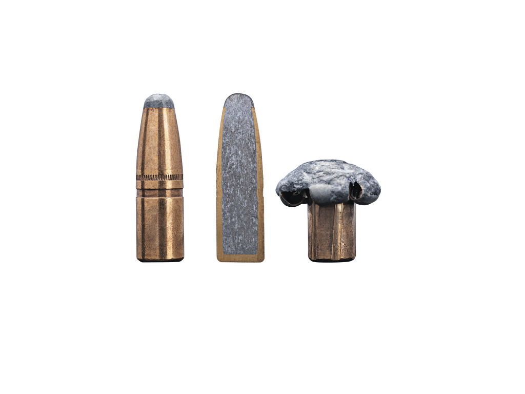 Una bala pesada encamisada y de punta blanda con un núcleo adherido. La forma y la construcción de la bala están especialmente diseñadas para evitar la separación del núcleo y proporcionar una proliferación controlada con un excelente poder de frenado. El diseño de punta redonda aumenta la velocidad de expansión y la confiabilidad. La bala es muy efectiva para la caza mayor a distancias cortas.
